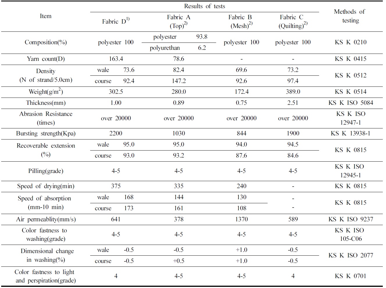 경기력을 향상시킬 수 있는 기능성 사회인 야구복을 제작하기 위해 땀 흡수와 배출이 뛰어나고 부드러운 질감과 활동하기 편안한 소재가 요구된다. 대부분의 사회인 야구복은 폴리에스테르 소재를 사용하고 있으나 소재가 뻣뻣하고 땀 배출이 원활하지 않아 경기 시 신체활동이 불편하다는 의견이 많은 것으로 나타났다. 이러한 불편사항을 개선하고, 경기 시 소재에 요구되는 특성을 고려하여 실험복 소재를 결정하였다. Table 1은 기존복과 실험복 소재의 물리적 특성을 비교한 것으로, 기존복 상의, 하의, 실험복 하의의 경우 섬유의 혼용률은 폴리에스테르 100%이며, 실험복 상의의 경우 폴리에스테르 93.8%, 폴리우레탄 6.2%의 원단이다.