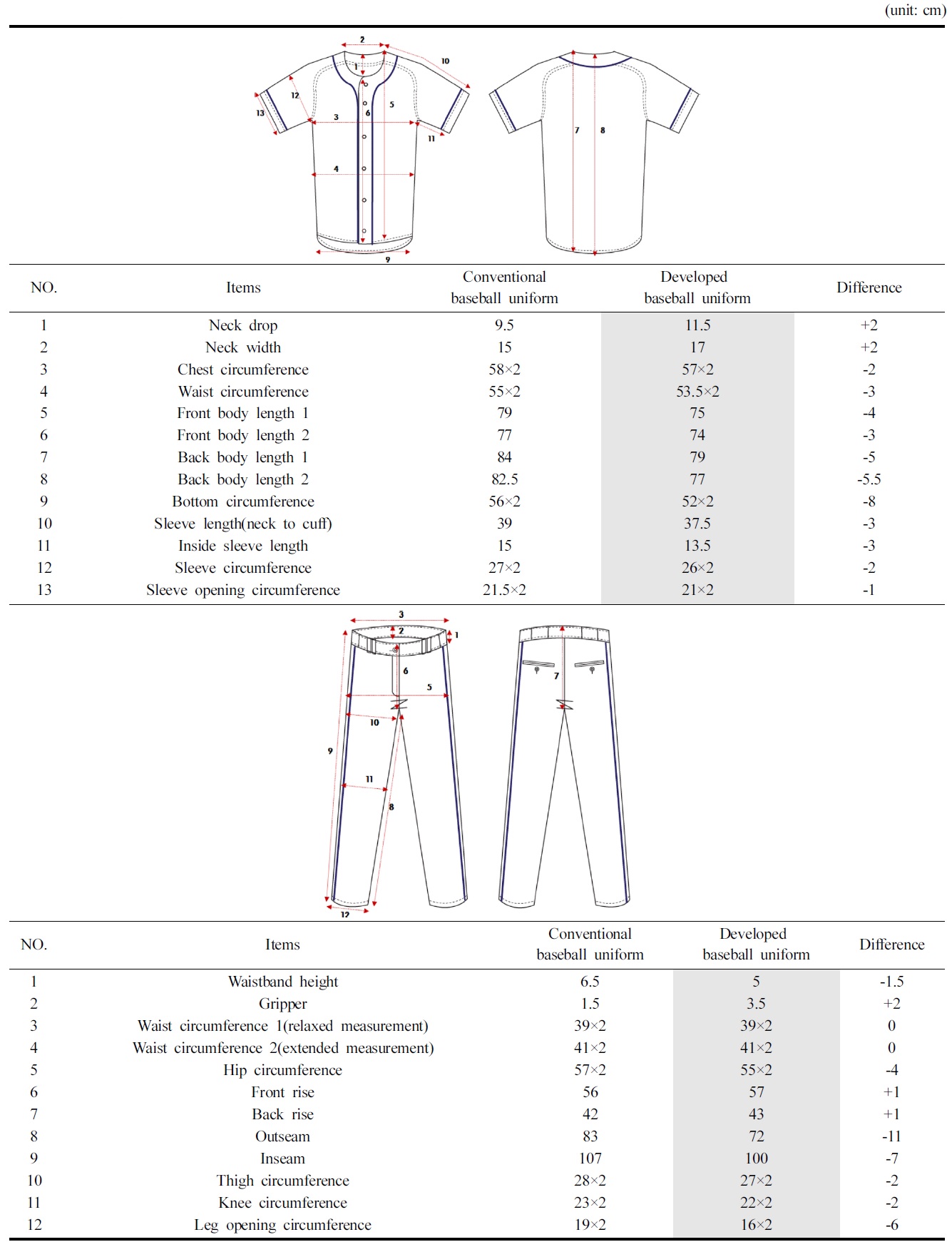 야구복의 상의는 겉상의와 이너웨어로 구성되며 안에 주로 기능성 이너웨어 또는 반팔티셔츠 등을 받쳐 입기 때문에 이와 구분하기 위해 겉상의라 불린다. 하의의 경우 발목까지 내려오는 일자형 바지와 무릎까지 내려오는 농군형 바지인 2가지 종류로 이루어져 있다. 본 연구에서는 겉상의와 발목까지 내려오는 일자형 바지를 개발 아이템으로 선정하였다.