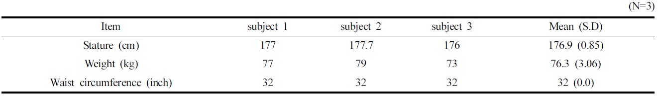 착의 평가는 1차 실험복의 불편사항과 개선사항을 수정 보완하여 2차로 제작된 실험복으로 진행하였다. 전문가 집단을 대상으로 한 외관 평가를 위해 연구 대상 사이즈에 적합한 피험자를 선정하였으며, 피험자에 관한 정보는 Table 3에 나타내었다.