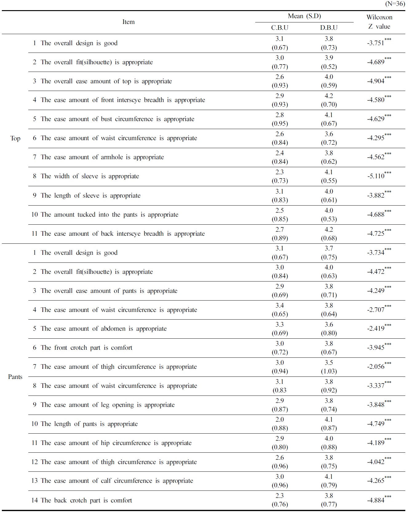 기존복과 실험복 상의의 외관 및 착용감 만족도에 유의한 차이가 있는지 확인하기 위해 비모수 검증인 Wilcoxon Test를 실시하였으며, 모든 항목에서 유의한 차이를 보였다. 평균값에서도 실험복이 기존복에 비해 모든 항목에서 높게 나타나 실험복 상의의 외관 평가가 우수한 것으로 나타났다.