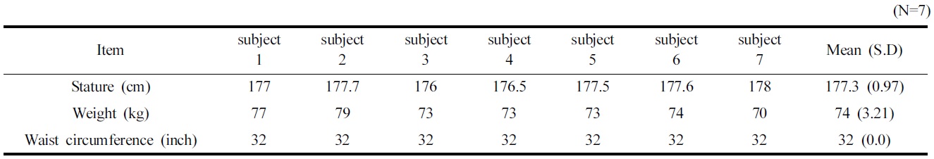 현장 착의 평가는 기존복과 본 연구에서 개발된 실험복의 만족도와 기능성에 대한 비교평가를 통해서 성능을 검증하고 개선점을 파악하기 위해 사회인 야구단에 참여 중인 성인 남성 7명을 대상으로 실시하였다. 현장 착의 평가를 위해 연구 대상사이즈에 적합한 피험자를 선정하였으며, Table 5에 7명의 피험자 인체 정보를 나타내었다.
