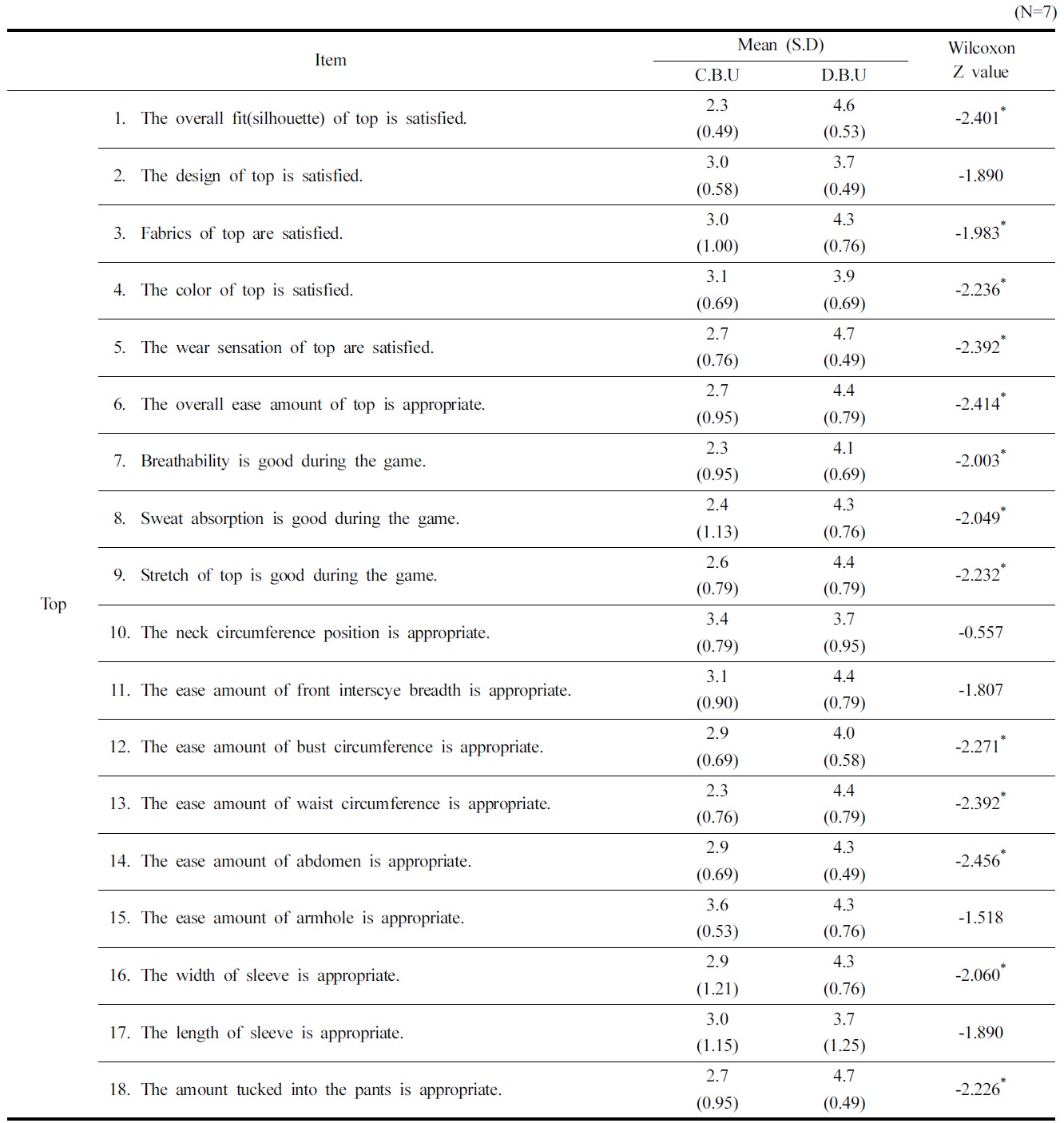 기존복과 실험복 상의의 외관 및 착용감 만족도에 유의한 차이가 있는지 확인하기 위해 비모수 검증인 Wilcoxon Test를 실시하였으며, 5항목을 제외한 대부분의 항목에서 유의한 차이를 보였다. 평균값에서도 실험복이 기존복에 비해 모든 항목에서 높게 나타나 실험복 상의의 외관 및 착용 만족도가 우수한 것으로 나타났다. 평균값을 살펴보면 상의의 착용감에 만족한다와 바지 안으로 넣는 상의의 밑단 분량이 적당하다는 문항에서 실험복의 평균값이 4.7로 높게 나타났으며 상의의 전체적인 핏(실루엣)에 만족한다는 문항도 4.6으로 높게 나타났다. 이는 선행연구(Kim et al., 2015)의 설문조사결과 불편 사항으로 조사되었던 상의가 하의에서 빠진다, 상의의 길이가 길다, 바지안으로 넣는 상의가 접혀 불편하다와 같은 기존복의 맞음새와 길이에 대한 문제점을 파악하고 수정 보완하여 소비자의 요구를 실험복에 반영한 것으로 긍정적인 평가를 받은 것으로 사료된다. 실험복의 경우 경기 시 상의의 신축성이 좋다, 경기 시땀 흡수가 잘된다, 상의의 소재가 만족스럽다는 문항에서 각 각 4.4, 4.3의 점수를 얻어 기존복에 비해 높게 나타나 소재에 대한 만족도가 좋은 것으로 평가되었다. 또한 경기 시 통풍이 잘된다라는 문항에서의 평균값이 기존복은 2.3, 실험복은 4.1로 실험복이 높게 나타났다. 이는 실험복의 경우 기존복 소재와 비교하여 신축성이 향상된 소재를 사용하였으며, 겨드랑이 부위, 등부위와 상의의 밑단에 메쉬 소재를 사용하여 통풍성을 개선해 소재에 대한 만족도가 높아진 것으로 사료되며, 선행연구(Kim et al., 2015)의 설문조사 결과 땀 흡수와 통기성이 나쁘고 불쾌하다, 소재가 뻣뻣하고 무겁다와 같은 불편사항이 개선된 것으로 볼 수 있다. 또한 실험복의 경우 전체적인 여유량이 적당하다(4.4), 가슴 부위(4.0), 배 부위(4.3), 허리 부위(4.4)의 여유량이 적당하다, 소매통 넓이는 적당하다(4.3)는 문항에서 평균값이 높은 것으로 나타나 기존복에 비해 전체적인 여유량에서의 만족도가 높은 것으로 나타났다. 이 결과는 Table 6에 함께 나타내었다.
