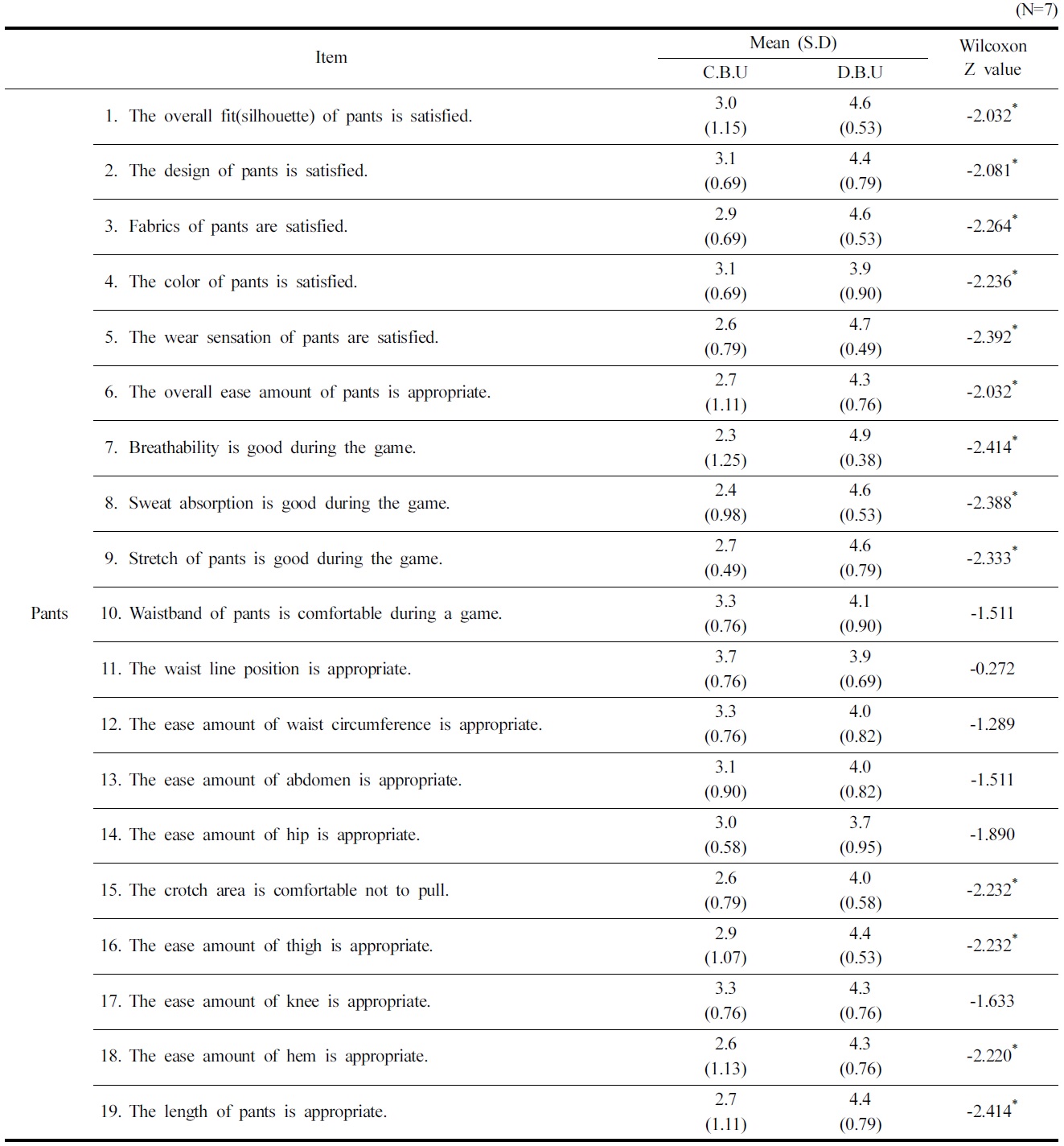평균값을 살펴보면 바지의 길이는 적당한가, 종아리 부위의 여유량은 적당한가라는 문항에서 실험복의 평균값이 4.1로 높게 나타났으며, 하의의 전체적인 핏(실루엣)은 좋은가, 엉덩이 둘레의 여유량은 적당한가 문항에서도 4.0으로 높게 나타났다. 바지 길이의 경우 기존복 평균값이 2.0으로 가장 낮게 나타났고, 바지의 길이가 길다는 의견이 많았는데 키, 몸무게, 허리둘레 치수만으로 야구복을 제작하므로 정확한 다리길이를 알 수 없어 대부분 수선을 맡기는 형태라 볼 수 있다. 또한 넙다리 부위의 여유량은 적당한가 항목에서 기존복은 2.6, 실험복은 3.8로 실험복이 높게 나타났으며, 기존복의 여유량이 많다는 의견을 보였다. 뒷밑위부위는 당기지 않고 편안한가라는 항목에서도 기존복은 2.3, 실험복은 3.8로 나타났으며, 이는 실험복의 뒷밑위길이를 기존복에 비해 1cm 증가시켜 긍정적인 평가를 받은 것으로 사료된다(Table 4).