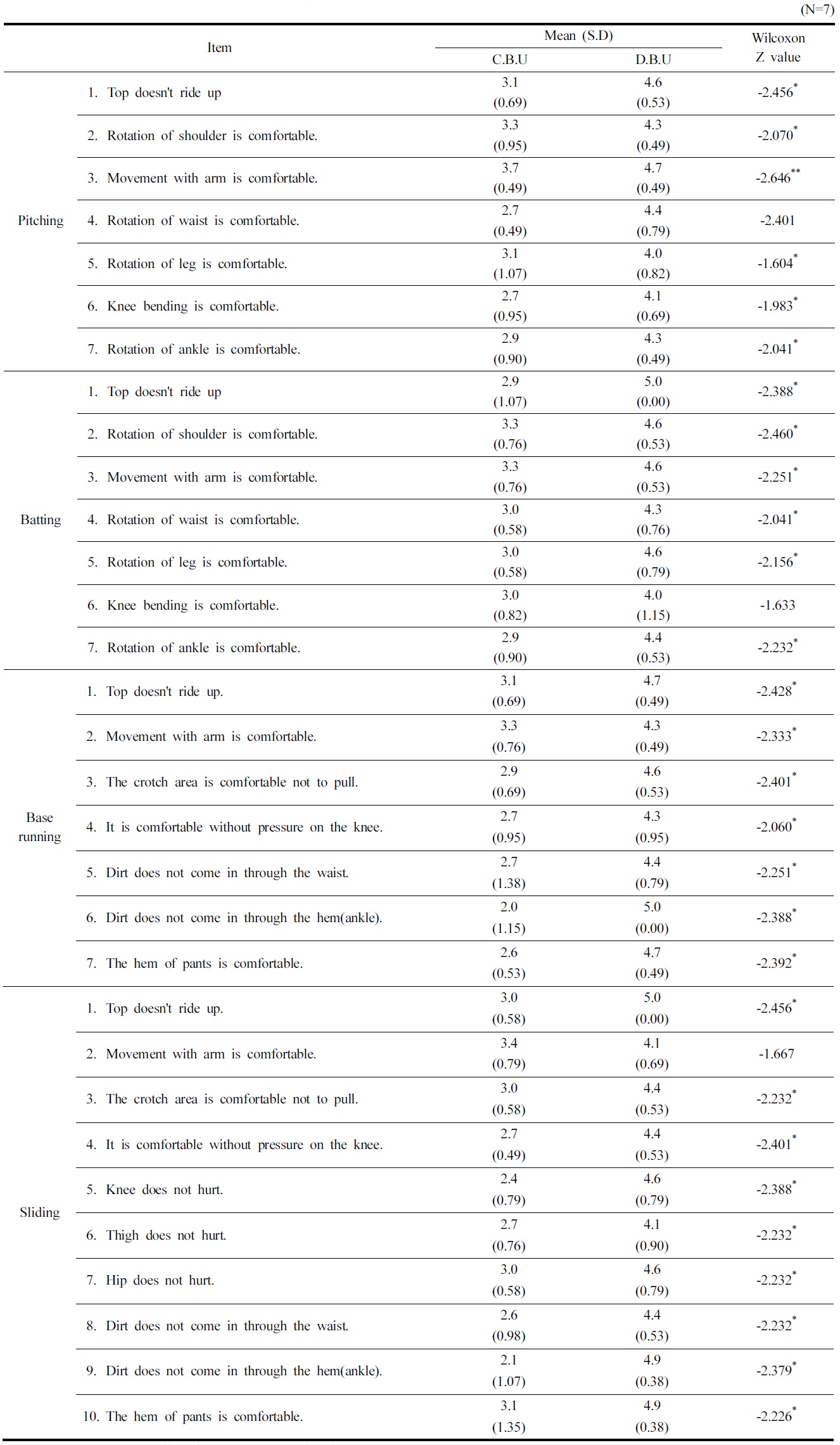 주루 동작의 경우 모든 문항에서 유의차가 나타났으며, 흙이 발목 안으로 들어오지 않는다는 문항에서 5.0으로 가장 높게 나타났으며, 상의가 빠져나오지 않는다, 바지 밑단이 편안하다 문항에서도 4.7로 높게 나타나 기존복과 큰 차이를 보였다.