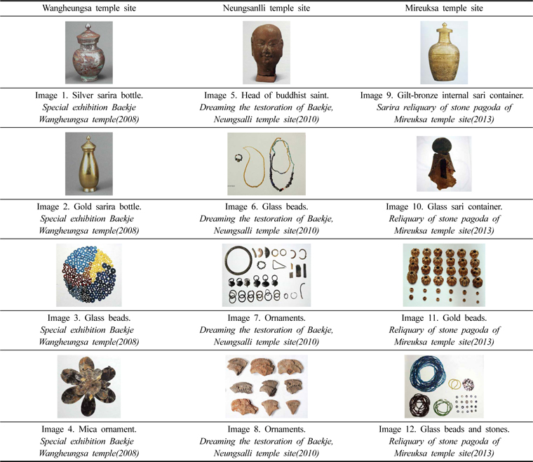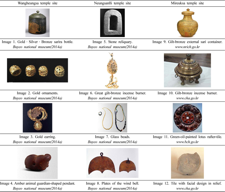 사리란 인도 산스크리스트어 “사리라(sarira)”라는 말을 한자어로 옮긴 것으로, 원래의 뜻은 몸이나 뼈, 시신, 유골 등을 뜻한다. 사리장엄은 이러한 성스러운 사리를 엄격한 법식에 의해서 갖추어 꾸미는 총체적 행위로, 구체적으로는 사리를 직접 담는 사리기부터 시작하여, 사리기를 안치하는 공간, 사리를 공양하기 위해 행해지는 각종 의례와 의례 관련 용품, 그리고 사리에 바쳐진 각종 공양품을 포괄한다(Ju, 2013). 사리장엄구는 사리를 담는 유리병, 금사리함, 은이나 동으로 만든 외함(外函)으로 구성되며, 탑의 심초석(心礎石)이나 기단부 또는 탑신부에 자리를 만들어 봉안하였다. 삼국시대 사리장엄구의 현존 사례가 거의 없는 가운데, 2007년 부여 왕흥사지에서 금·은·동 삼중 구조의 사리함이 명문과 함께 발견되었고, 2009년에는 익산 미륵사지 서탑을 해체 보수하던 중 화려한 금사리병이 발원문과 함께 수습되어 백제 사리장엄구의 실체를 알 수 있었다(Buyeo National Museum, 2014b). 백제 사리장엄구는 567년 능산리사지, 577년 왕흥사지, 639년 미륵사지의 것이 있다. 사리기의 내용으로 보아 이들은 모두 왕실, 왕권과 밀접한 관련이 있다. 위덕왕 때 만들어진 왕흥사는 사리공양과 사찰 건립의 주체가 창왕(昌王) 즉, 국광이었으며, 목적은 “죽은 왕자를 위한 것”이었다. 미륵사의 경우는 왕후가 재물을 희사하여 사찰을 만들었으며, 목적은 국왕과 왕후의 건강·장수를 기원하는 것이었다. 능산리 절터의 주체는 공주로 되어있으나 목적은 보이지 않는다(Lee, 2010).