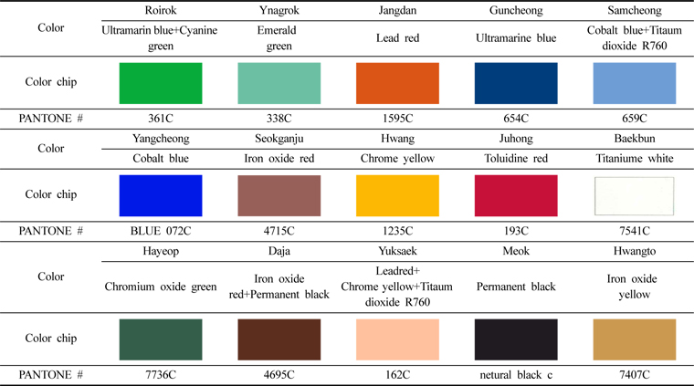 단청은 목재의 방습과 방부 효과를 위한 내구적인 목적으로 쓰이기도 하였고, 목재가 갖는 재질의 단점을 보완하기 위한 수단으로 쓰였다. 또한, 장식할 수가 있어서 건축의 권위와 위엄을 나타내고 왕권이나 종교적인 위엄을 위하여 궁궐이나 사찰 사당 등에 사용되었다. 이처럼 단청은 보기에 아름답기만 한 그림의 의미가 아닌 건축물을 비롯한 여러 조형품과 공예품들의 손상을 방지하고 보존시키기 위한 지혜와 우주 만물의 원리와 이치에 순응하고 주술적인 의미를 담아 기원하는 모습, 그리고 위엄과 장엄함을 표현한 장식적인 의미를 표현하는 것으로 볼 수 있다(Jeong et al., 2010). 단청의 색상 표현이나 배열 순서 색은 우리 민족의 생활기반인 음양오행설(陰陽五行說)이라는 일정한 규칙에 따랐다. 청(靑), 적(赤), 황(黃), 백(白), 흑(黑)의 오방색을 기본으로 하여 여기에 먹이나 분을 혼합한 간색을 만들어 다양한 색채로 사용하였다. 오늘날 단청에 주로 사용되는 안료는 원색과 혼색을 포함해 대략 20여 종에 이른다. 원색은 양록, 장단, 주홍, 양청, 군청, 석간주 황토, 뇌록, 호분, 지당, 먹 등이며, 혼색은 육색, 삼청, 하엽, 다자, 뇌록, 미색(가칠용) 등으로 구분된다(Gwak, 2002). 단청의 색상을 정리하면 Table 3과 같다.