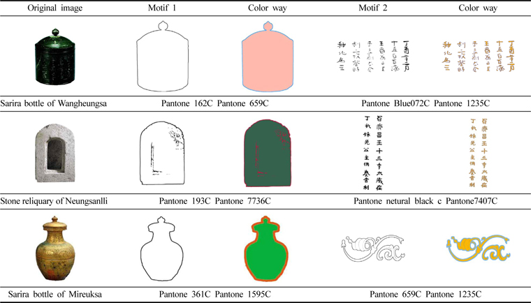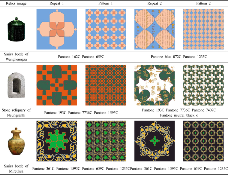 왕흥사 출토 유물에서는 사리함에 새겨진 왕흥사 창건과 관련된 명문 기록을 나타낸 명문 ‘丁酉年二月, 十五日百濟, 王昌爲亡王, 子立刹本舍, 利二枚葬時神化爲三’(Buyeo National Museum, 2014a), 즉 ‘정유년(577년) 2월 15일에 백제왕 창(百濟王昌)이 죽은 왕자를 위하여 찰(刹)을 세우는데, 2매였던 사리가 장시(葬時)에 신(神)의 조화로 3매가 되었다’는 문장을 모티프로 활용하였고, 미륵사지 사리공양구에서는 사리함에 새겨진 문양 중에서 넝쿨문을 모티프로 추출하였다. 능산리사지의 사리공양구에서는 석재 사리감 앞면에 새겨진 명문인 ‘百濟昌王十三年太歲在 丁亥妹口公主供養舍利’(Buyeo National Museum, 2014b)를 모티프로 활용하였다. 색상이 적용된 모티프는 모티프의 확대, 축소, 중첩, 재배치 등의 기법을 활용하여 패턴 1과 패턴 2로 전개하였다.