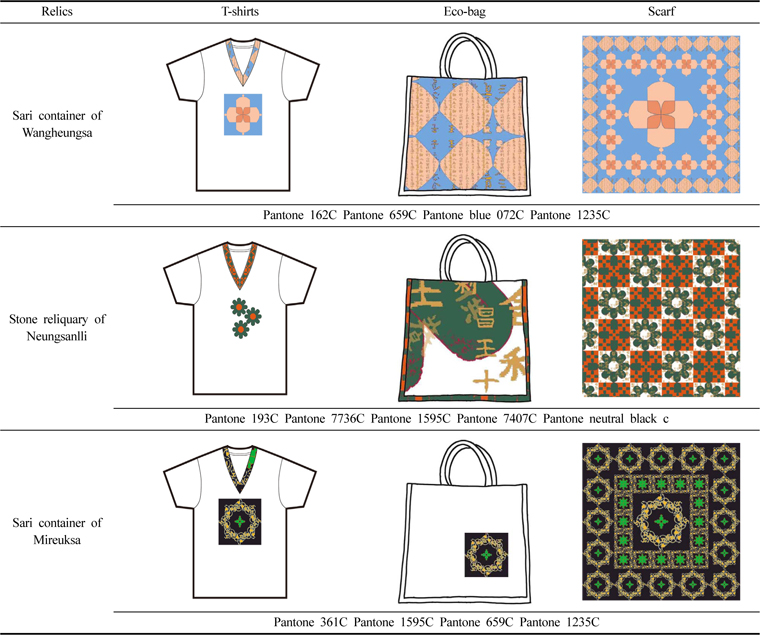 Buddhist culture had a significant impact on the entire mode of Korean living after the introduction of Buddhism to Korea in the Three Kingdom Period. Baekje embraced Buddhism in 384 A.D.; subsequently, diverse artifacts have now been excavated from the temples. Various research on Korean temples are now in progress; however there is inadequate research on the relics and patterns excavated from the temples due to the focus on the temples’ architectural form. There is limited research on the development of fashion cultural products that use relics excavated from the temples. This study develops designs for fashion cultural products using Baekje Sabi Period relics; specifically, the sari container excavated from Buyeo’s Wangheungsaji, Neungsanrisaji, and Iksan’s Mireuksaji. The sari container’s original form, patterns, and writing were developed into patterns and applied to fashion products such as t-shirts, bags and scarves. Traditional multicolored paintwork exhibited on the temples, ‘dancheong’, was selected as the color for products that can symbolically express the nature of their origin. Adobe Illustrator CC and Adobe Photoshop CC were used to extract the motifs and develop the designs. Six patterns and nine fashion products were designed, accounting for a total of fifteen developed items. We hope that the fashion cultural product design expresses the distinct characteristics of Baekje’s Sabi Period and can be applied to various products and related fields.