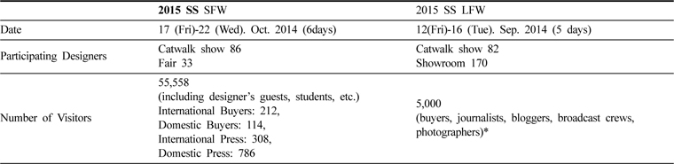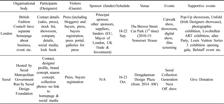 Several studies have been carried out on the subject of developing Seoul Fashion Week (hereafter, SFW): Analysis on the current status of Seoul Fashion Week and study on the methods of its mid- and long-term development (Kim, 2012), Research on “Korean” collection as high added value fashion industry -by comparison of status and characteristics of domestic and international collections (Joo, 2009), The development strategies of SFAA, Seoul collection (Kim, 2008a), The development strategies of the Seoul fashion industry (Kim, 2008b) and An exploratory study for the market of Seoul collection - from the collection participants’ perspective (Han & Lee, 2008). A number of press articles (Ham, 2011; Kim, 2015; Lee, 2013; Lee, 2014), report the strengths and weaknesses of each collection, particularly in organisational terms. Organisational issues are crucial for assessing the present as well as planning future directions. It is also important to look into the success and problems in order to construct a correct and realistic development plan. However, no detailed academic studies about SFW organisational issues were made available after the year 2012, when separate collections were combined into one, despite the great quantity of news and magazine articles on this topic. The aim of this paper is to define the current situation of SFW, particularly after 2012. To do this, it is helpful to look at the key factors of some successful events of this kind. London Fashion Week (LFW) can be a good model as an independent, yet powerful, organisation.
