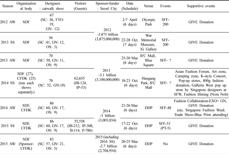 Seoul Fashion Week is a biannual fashion showcase event sponsored by the Seoul Metropolitan government. It aims to become the world’s fifth leading Fashion Week, following London, Milan, New York and Paris (Seoul Design Foundation, 2015a). Although its 16-year-old history is short compared to others, its growth has been remarkable.