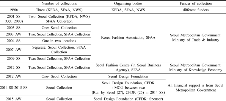 The first fashion show in Korea was by Nora Noh on 29th November 1959 at the Bando Hotel (Noh, 2007). The first regular group fashion show started from SFAA (Seoul Fashion Association) 1991 SS (November, 1990). In the 1990s there were a number of similar well-established fashion shows showcasing events such as the KDFA, SFAA and NWS Seoul Collections. SFAA, established in 1989, is led by designers from the Kookje Design Institute or the Choongang Design Contest. Since then, it has been holding two fashion shows every year. KFDA (Korea Fashion Designers Association), established in 1961, is based on boutique designers near Myoungdong and NWS (New Wave in Seoul), established in 1992 by new and young designers, when SFAA and KFDA were already established (Park, 2000). Because of the different interests and goals, collections were held separately, despite Seoul City’s combining efforts. In 1998, the Ministry of Trade, Industry & Energy, together with Seoul Metropolitan Government, launched Seoul Collection as a event of ASEM which combined KFDA, NWS and other independent designers. In October 2000, Seoul Collection launched its first fashion shows. After that, there have been two fashion collections in Korea: the Seoul Collection and the SFAA Collection. Shows’ schedules, ticket sales and PR are organised separately. This is wasteful of labour, money and PR, and weakens the collections in terms of attracting international attention to one city. Finally, after significant efforts towards unification, the year 2003 saw the first combined SS collection. However, this did not last beyond that year because of distribution problems in scheduling shows, fee administration, funding, tickets, etc. Until 2012 there were separation and unification in succession. Finally, one collection was held in 2012. It was hosted by the Seoul Metropolitan Government and co-run by Seoul Design Foundation and CFDK (Council of Fashion Designers of Korea). CFDK was established in 2012 by combining separate designer groups, in order to “create a truly unified fashion designer association that will bring every fashion designer organizations and individual designers together” (Council of Fashion Designers of Korea, 2015). Since then, CFDK has worked together with, or against, SDF for SFW. Table 3 shows the chronological order of fashion collections in Korea and Seoul Fashion Week’s organisational bodies.