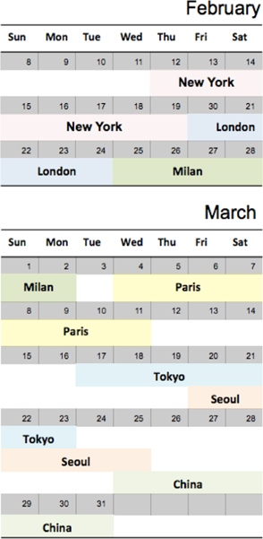 SFW is held in March and October. Table 6 is a 15 AW schedule of the world’s Fashion Weeks. Buyers and press travel from New York to London, Milan and Paris without break. Buyers interested in new Asian brands keep their leftover budget for Asia, mostly Tokyo. However, most of the buying is done by the end of the Big 4.