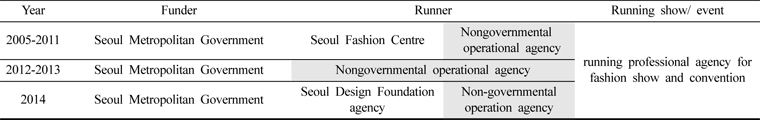 After years of adjustment, Seoul Design Foundation finally became one organisational body in 2012. Far from being independent, however, SDF is part of the government. Further, it does not have enough staff members. In Seoul Metropolitan Government there are only four or five people in charge of fashion events. Their duties include not only Fashion Week but also, for instance, planning a fashion museum. So, it is hard to consistently focus on Fashion Week throughout the year (“Fashion industry team organisation chart”, 2015). As to its running body, the BFC has 37 people working for Fashion Week and related events. In SDF, on the contrary, there are only 8 in charge of Seoul Fashion Week: these are the fashion team at the Fashion Culture head office run by the Seoul Metropolitan Government. Their duties include not only SFW but also the administrative role of the Export Support Centre, Fashion Creative Studio, the promotion of global fashion brands, the management of the Modelist contest (Seoul Design Foundation, 2015b). In this situation, hiring an agency is unavoidable. Table 7 shows the succession of SFW running bodies.