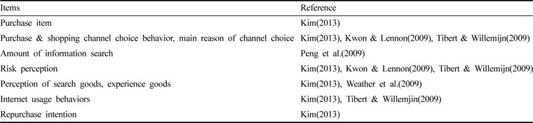 설문지에는 최근 구매한 아이템 종류, 쇼핑 전 정보탐색과 구매 시 선택한 채널 유형 및 선택 이유에 관한 문항으로 구성하였으며, 쇼핑채널에 대해서는 한 개의 쇼핑채널만 운영하는 경우와 복수의 쇼핑채널을 운영하는 경우로 나누어 선택하게 하였다. 또한, 정보탐색 시점 및 구매시점에서 위험지각은 제품특성(디자인, 색상, 사이즈 등), 가격, 제품다양성, 구매결제 안전, 개인정보보호, 전반적인 서비스에 관한 염려를 7점 척도로 측정하였으며, 정보탐색의 시간과 양, 인터넷 사용습관(사용시간, 이메일 수신여부, 인터넷 사이트 방문 비율 등)을 질문하는 내용이 포함되었다. 의류 아이템에 따라 경험적 제품으로 지각하는지, 탐색적 제품으로 지각하는지를 측정하는 문항을 7점 척도로 측정하였고, 향후 동일 채널에 대한 재구매 의도를 묻는 문항 등을 포함하였다. 특히 미국 소비자 온라인 쇼핑관련 설문문항을 구성하기 위해서 미국 Gap 브랜드 쇼핑몰에서 구매완료 직후 실시하는 소비자 구매 만족도 조사문항을 참고하여 영어설문 문항을 구성하였고, 미국 온라인 설문조사 회사의 수정 보완으로 완성하였다(Table 1).