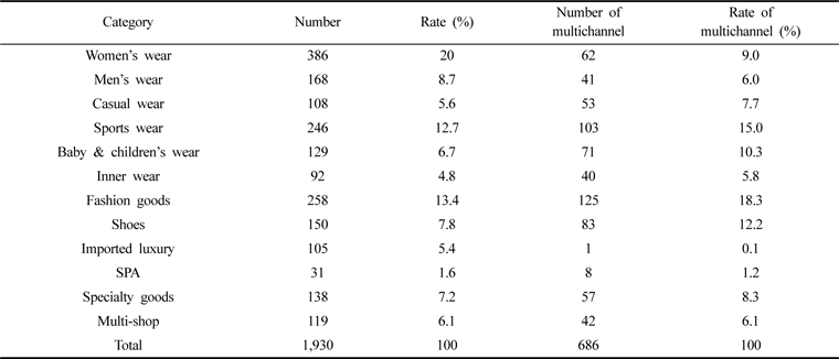 어패럴뉴스사에서 조사한 한국패션브랜드연감에 따르면 조사한 총 1930개 브랜드 중에서 멀티채널 활용 브랜드의 비율은 다음 Table 2와 같다. 전체 복종별 카테고리의 수는 여성복 브랜드가 가장 많았고, 그 다음으로 패션잡화와 스포츠 브랜드가 비슷하게 많았으며, 남성복, 제화, 특종상품(모피, 우양산, 홈 컬렉션 등), 유아동복, 편집멀티숍, 캐주얼, 수입명품, 이너웨어, SPA의 순으로 많은 것으로 나타났다. 인터넷 쇼핑몰을 포함한 멀티채널을 활용하고 있는 기업의 비율은 패션잡화의 경우가 가장 높았고, 그 다음으로는 스포츠웨어, 제화, 유아동복, 여성복, 특종상품, 캐주얼, 편집멀티숍, 남성복, 이너웨어, SPA브랜드, 수입명품의 순으로 나타나, 아직도 수입명품의 경우 오프라인 매장유통에 집중하며 온라인 등 멀티채널 활용은 많지 않은 것을 알 수 있었다.