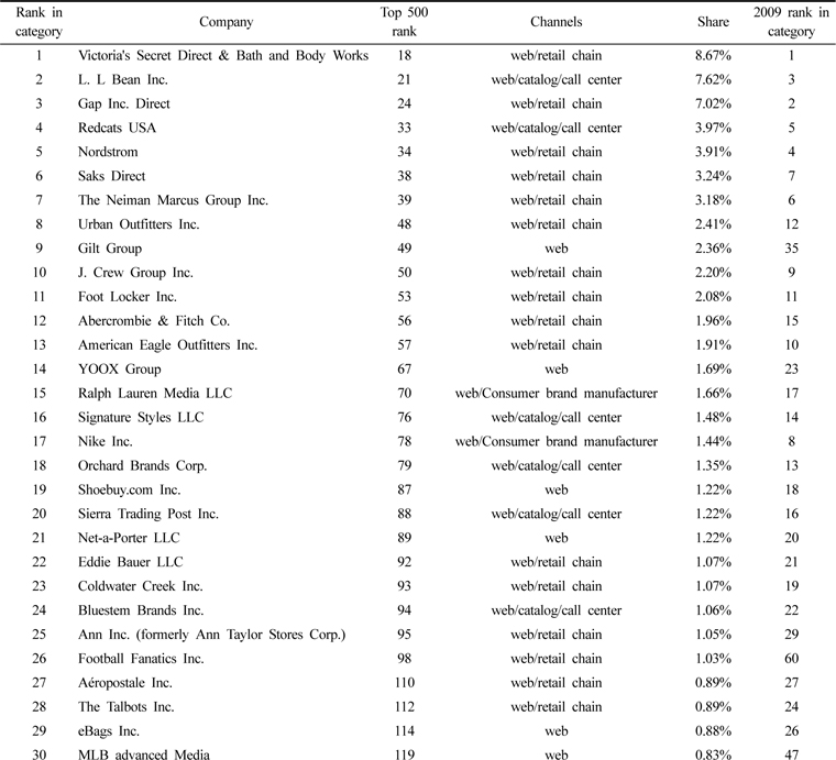 미국의 패션기업 멀티 리테일링 현황을 알아보기 위해 Top retail web sites에 대한 매출 분석에서 보면 멀티채널 리테일러들은 대부분 매출의 성장세를 나타내고 있다(Table 3). 2011년 미국의 500개의 top e-commerce 회사 중에서 어패럴/액세서리 업종은 128개 기업이 순위에 포함되었고, 그 중 26개 업체를 제외하고는 2개 이상의 채널을 활용하고 있는 멀티채널 회사였다(Internet Retailer Top 500 Guide, 2011). 대부분의 멀티 채널 기업의 경우 온라인 쇼핑몰과 오프라인 점포를 병행하고 있었지만, 카탈로그나 콜센터를 운영하고 있는 경우도 있었다. 이처럼 미국에서의 어패럴/액세서리를 제조, 판매하는 패션기업들은 온라인 채널의 활용에 매우 적극적이며, 미국의 지역적, 유통적 특성상 카탈로그나 콜센터 채널의 마케팅 활용이 보다 활발했다.