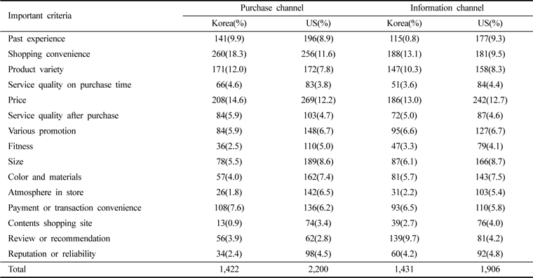 한국과 미국 소비자들은 의류를 구매할 구입채널을 선택할 때 고려하는 중요한 선택기준이 유사한 것으로 나타났다. 한국의 소비자의 경우 구입 채널 선택 시 쇼핑 편리성을 가장 중요한 요인으로 생각하고 있었고, 그 다음으로는 가격과 과거의 경험이 중요한 선택기준이었다. 미국 소비자의 경우는 가격이 가장 중요한 구입채널 선택기준인 것으로 나타났고, 그 다음으로는 쇼핑 편리성, 과거의 경험 순으로 중요하게 여기고 있었다.
