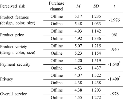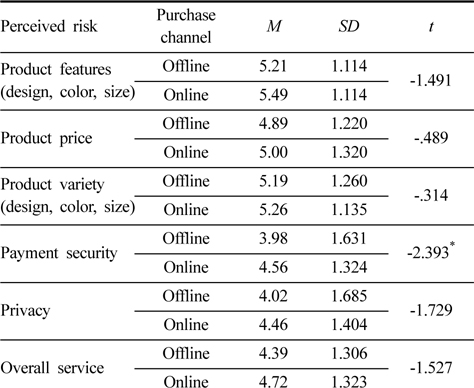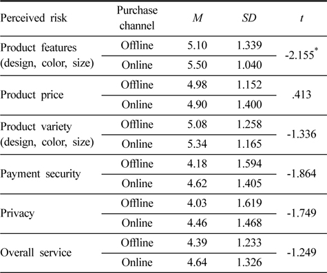 한국 소비자의 경우 속옷류에 대한 구매를 할 때 오프라인 채널과 온라인 채널에서 구매한 소비자 집단 간 지각된 위험의 평균치 차이를 조사하기 위해 t-test한 결과 제품특징(디자인, 색상, 사이즈)에서만 채널 간 유의한 차이가 나타났다. 온라인 소비자들이 오프라인 채널 구매 소비자에 비해 속옷류 구매 시 결제안전에 대한 위험 지각을 유의하게 높게 하는 것을 알 수 있었다(Table 13).