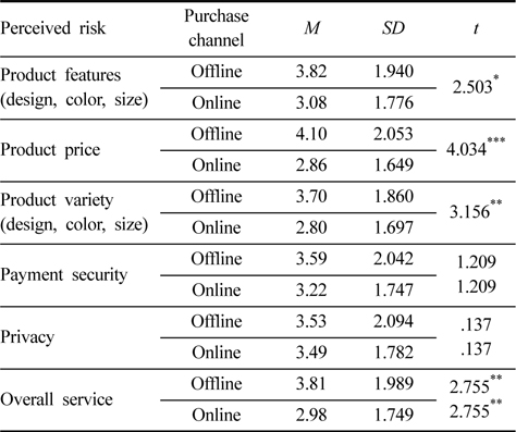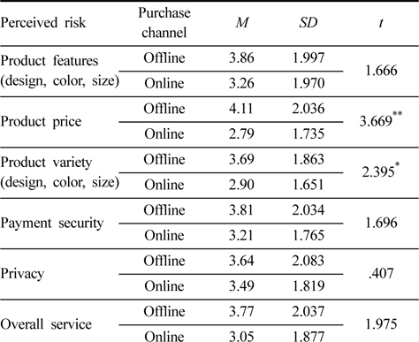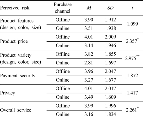 미국 소비자의 경우 외투류를 구입할 때 오프라인 소비자와 온라인 소비자 간의 위험지각에 있어 차이가 있는지 조사한 결과, 한국 소비자들과 다른 결과가 나타났다. 제품가격, 제품 다양성(디자인, 색상, 사이즈 등), 전반적인 서비스에 대한 염려에서 유의한 차이가 나타났다. 제품가격, 제품 다양성(디자인, 색상, 사이즈 등), 전반적인 서비스에 대한 염려는 오프라인 채널 구입 소비자가 더 높게 위험 지각하고 있는 것으로 나타났다(Table 6).