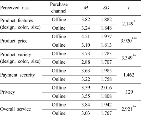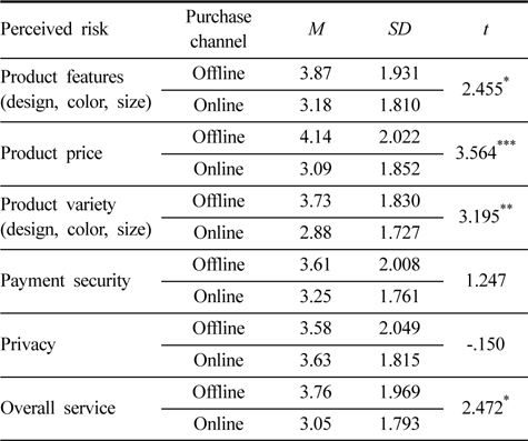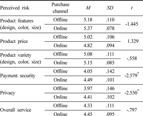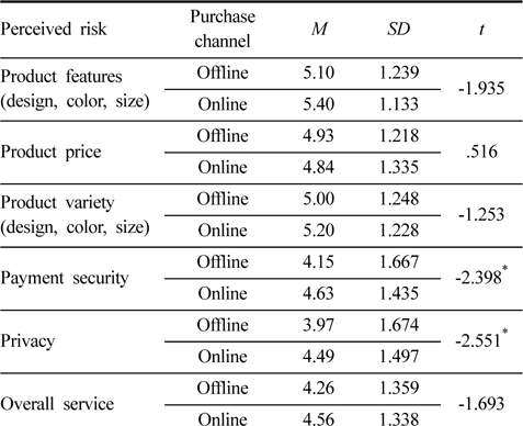 한국 소비자의 경우 상의류에 대한 구매를 할 때 오프라인 채널과 온라인 채널에서 구매한 소비자 집단 간 지각된 위험의 평균차이를 보기 위해 t-test한 결과 외투류 구입에서와 마찬가지로 결제안전과 개인정보보호 두 가지 요인에서 채널 간 유의한 차이가 나타났다. 결제안전과 개인정보보호에 대한 염려 요인에 대해 온라인 소비자들이 오프라인 채널 구매 소비자에 비해 유의하게 높게 위험 지각을 하는 것을 알 수 있었다(Table 7).