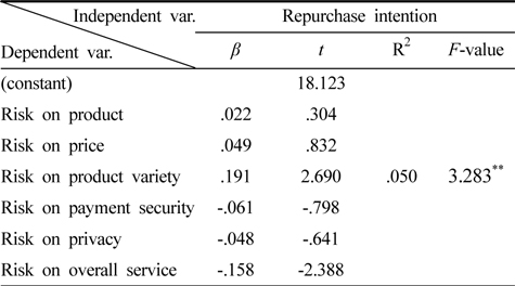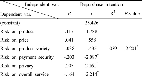 한국과 미국 소비자가 의류제품 구매 시 위험 지각의 정도가 다음 구매 시 동일한 채널에서 재구매할 것인지에 대한 의도에 영향을 미치는지 알아보기 위해 회귀분석한 결과 한국과 미국 소비자 경우 모두 구매 시 위험 지각이 구매채널의 재구매 의도에 유의한 영향을 미치는 것으로 나타났다.