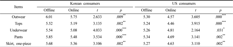 한국과 미국의 온라인과 오프라인 채널에 따른 소비자들이 구입한 아이템 5가지에 대해서 경험상품이나 탐색상품으로 지각하는 정도의 평균을 t-test 분석을 통해 비교해보았다. 5가지 의류제품 아이템에 대해서 경험상품으로 지각하는 정도를 비교한 결과 한국 소비자의 경우는 오프라인과 온라인 채널에 따라 소비자들의 경험상품으로 지각하는 정도의 평균차이가 유의한 것으로 나타났는데, 오프라인 채널 구매 소비자가 5가지 아이템에 대해서 모두 경험성이 더 높은 것으로 지각하고 있었다. 이는 6가지 의류 아이템에 대한 경험성, 탐색성을 고찰한 Kim(2010)의 연구와 일치하는 결과이다. 즉, 오프라인 채널에서 구매를 한 소비자는 대부분의 의류제품에 대해 매우 경험적 특성이 강하다고 지각하는 것을 알 수 있다. 그 중에서도 상의류와 속옷류에 대해서는 경험성의 지각정도가 약간 낮아 외투, 바지, 원피스류 등이 상의, 속옷류에 비해서 더 실물을 보거나 만져봐야 제품성과를 알 수 있다고 생각하는 측면이 강하다고 할 수 있다. 미국 소비자의 경우도 오프라인 채널 구매 소비자들이 온라인 채널 구매 소비자들에 비해 5가지 의류제품 아이템에 대해 모두 경험성이 높은 상품으로 지각하고 있었다(Table 17).