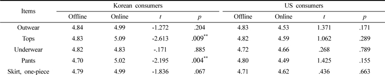 한국과 미국 소비자 각각에 대해 5가지 의류 제품에 대한 탐색성 지각정도를 조사한 결과 한국 소비자의 경우 상의류와 바지류 두 가지 아이템에 대해서만 오프라인 채널 구매 소비자가 온라인 채널 구매 소비자에 대해 탐색성이 더 낮게 지각하는 것으로 나타났다. 온라인 채널 구매 소비자는 상의류와 바지류는 제품 실물을 입어보거나 만져보지 않아도 제품에 대한 설명을 읽거나 사진들을 보면 제품에 대해서 평가할 수 있는 제품으로 지각하고 있었고, 이는 채널별 소비자 특성을 고찰한 Kim(2010)의 연구결과와도 일치한다. 이에 비해 미국 소비자의 경우는 오프라인과 온라인 채널간의 유의한 차이가 나타나지 않았다(Table 18).
