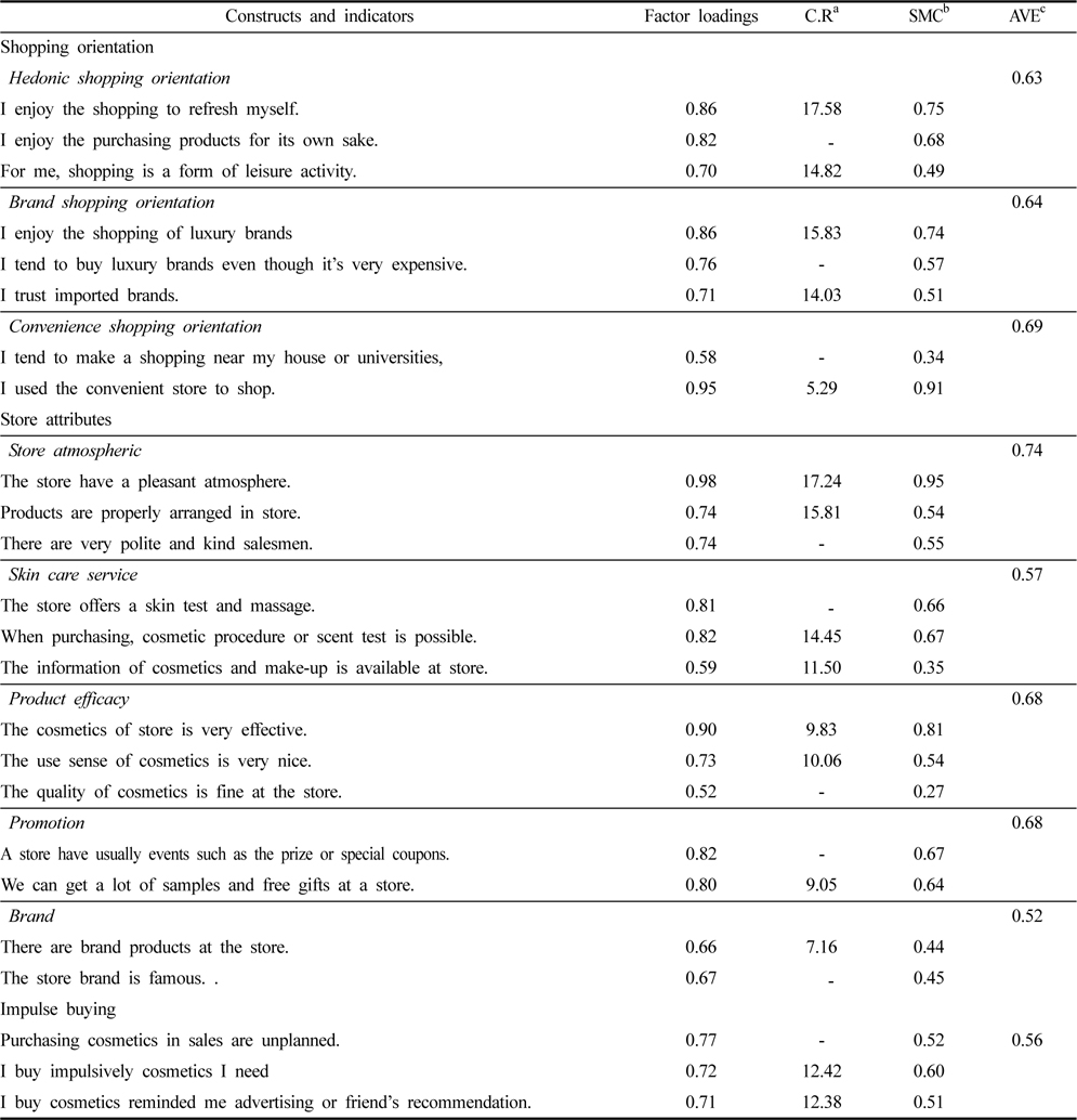 본 연구의 자료 수집을 위해 선행연구들을 근거로 질문지를 개발하였다. 기능성 화장품 소비자들의 일반적인 쇼핑성향은 Park and Kim(2008), Sun and Yoo(2004)의 연구결과를 중심으로 구성하였으며, 기능성 화장품 구매 시 인지하는 점포 속성 문항은 Lee and Koo(2009), Park and Koo(2009)의 연구에서 사용한 문항을 중심으로 기능성 화장품에 적합하도록 수정, 보완하여 구성하였다. 충동구매행동 문항은 Park and Forney(2004)의 연구결과를 근거로 구성하였다. 모든 문항은 5점 척도(1=전혀 그렇지 않다, 5=매우 그렇다)로 측정하였으며 인구통계적 특성도 조사하였다. 도출된 연구 가설을 검증하기 위하여 SPSS 18.0과 AMOS 18.0을 사용하여 구조방정식 모형분석을 실시하였다.