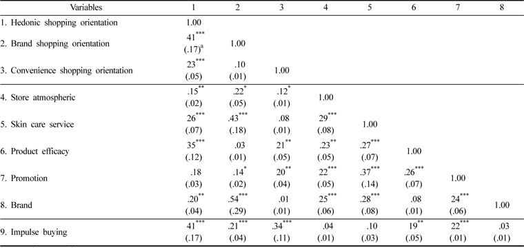 요인분석 결과, 쇼핑성향은 쇼핑을 기분 전환이나 즐거움으로 여기는 쾌락적 쇼핑성향, 수입 브랜드를 선호하는 브랜드 쇼핑성향, 쇼핑의 편리함을 선호하는 편의적 쇼핑성향으로 추출되어 Lee and Lee(2003), Park and Kim(2008), Sun and Yoo(2004)의 연구결과를 부분적으로 지지해 주었으며, 기능성 화장품 쇼핑성향을 분석한 Kim and Hwang(2013)의 연구결과를 부분적으로 지지해주었다. 소비자들이 인지하는 기능성 화장품의 점포속성은 점포 분위기/판매원 요인, 스킨케어 서비스 요인, 제품의 효능, 품질 등에 관한 제품 기능성 요인, 사은행사, 샘플 증정 등의 판매촉진 요인, 브랜드 요인이 추출되어 여자대학생을 대상으로 한 Park and Koo(2009), Sun and Yoo(2004)의 연구결과를 뒷받침해 주었다. 또한 충동구매행동은 단일 차원으로 확인되어 Park and Forney(2004)의 연구결과를 지지해 주었다.