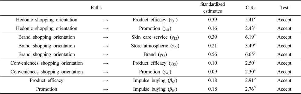 Table 3과 Fig. 2에 의하면, 기능성 화장품 소비자들의 쇼핑성향과 점포속성의 관계에서, 쾌락적 쇼핑성향은 점포 속성 중 제품 기능성(γ31=.39, t-value=5.41, p<.001), 판매 촉진(γ41=.16, t-value=2.45, p<.05)에 유의한 영향을 주었다. 즉, 기분 전환이나 여가 활동의 하나로 쇼핑을 즐기는 소비자들은 기능성 화장품을 구매할 때 화장품의 효능, 효과, 사용감 등의 제품 기능성을 중요하게 인지하였으며, 사은 행사, 샘플 증정 등의 판매촉진 활동도 중요하게 인지하는 것으로 나타났다. 그러나 점포 분위기나 판매원의 친절, 점포에서 제공하는 스킨케어 서비스나 브랜드에 대해서는 유의미하게 인지하지 않는 것으로 나타났다.