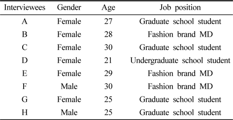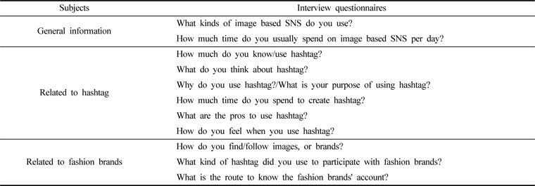 가설 검증에 앞서 이미지 기반 SNS에서 해시태그의 이용동기를 추출하기 위한 문항을 도출하기 위하여 정성적 분석을 실시하였다. 심층면접에 앞서 이미지 기반 SNS를 이용해 본 적이 있고, 새로운 패션제품 및 유행에 개방적 성격을 가진 패션마케팅 대학원생 20명을 대상으로 사전조사를 실시하였다. 응답자들이 SNS를 사용하는 보통 평균 시간은 30분 이내, 이미지 기반 SNS의 평균 하루동안의 접속횟수는 5회 이내, 하루에 이미지를 업로드하는 횟수는 5회 이내가 가장 많게 나타났다. 그 다음, SNS의 이용시간이 1시간 이상, 접속횟수가 하루 5회 이상 있다고 나타난 이미지 기반 SNS의 해비유저 8명을 대상으로 심층면접을 실시하였다. 이는 기존의 연구들에서 이미지 기반 SNS에서 해시태그의 이용동기나 현황에 대해 밝혀진 바가 없으므로 양적인 조사를 위한 설문지 작성의 기초적인 자료를 수집하기 위한 것이었다. 본문에서는 중복된 내용들이 있어 6명의 인터뷰 내용을 바탕으로 정리하였다. 피면접자의 구성은 Table 1에 제시하였다. 면접은 2014년 10월 27일부터 10월 31일에 걸쳐 이루어졌고, 면접시간은 평균 1시간에서 1시간 30분 정도가 소요되었다. 면접 질문은 이미지 기반 SNS의 이용동기를 심층면접과 선행연구들을 바탕으로 도출한 Ko et al.(2014)의 연구와 소셜미디어의 이용동기를 선행연구를 통하여 도출하여 체계적으로 분류하였다. 이러한 이용동기에 관한 체계화를 표적집단토의와 트위터 내용 분석이라는 질적인 연구를 통하여 실증적으로 증명한 Lee et al.(2013)의 연구를 참고하여 이용동기에 관련하여 면접 대상자 각자가 생각하는 해시태그의 특성 또는 특징은 무엇인지와, 가장 많이 사용하는 해시태그에는 어떤 것들이 있는지에 대한 내용이며 내용은 Table 2와 같다.