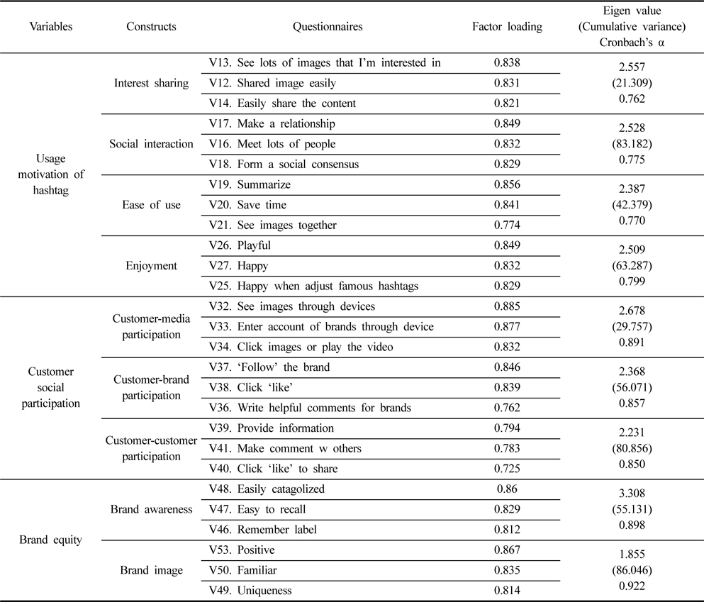 본 연구에서 제시된 모형의 척도를 검증하기 위해 먼저 탐색적 요인분석과 확인적 요인분석의 두 방법을 모두 실시하였다. 본 연구에서는 해시태그의 이용동기에 관한 변인을 측정하기위해 사용된 문항은 인용할 만한 선행연구가 충분하지 않았고, 해시태그가 이미지 기반 SNS에서 가장 활발히 사용되고 있는 현상(An, 2014; Kim, 2015)을 반영하여 선행연구의 이미지 기반 SNS의 이용동기들을 참고하여 해시태그의 이용동기도 이러한 특성이 잘 반영되어야 한다고 예상하였기 때문에 Ko et al.(2014)의 이미지 기반 SNS 이용동기 및 기존의 SNS 이용동기의 개념을 본 연구에 맞추어 수정 보완하여 구성하였다. 따라서 측정 도구의 판별타당성 및 내적일관성을 측정할 필요가 있어 먼저 탐색적 요인분석을 실시하였다. 요인추출 방식은 베리멕스 방식을 이용한 주성분분석을 하였고, 고유치 1.0 이상, 요인부하량 0.5 이상인 경우만 채택하였다. 본 연구에서는 측정 변인에 대한 각 요인별 신뢰도가 모두 0.7 이상으로 내적 일관성을 확보하였다. 그 결과는 아래 Table 3과 같다. 독립변인의 탐색적 요인분석 결과, 해시태그의 이용동기가 관심공유성, 상호작용성, 편의성, 유희성의 4개의 요인으로 분리되었으며 고유치가 모두 1.0 이상을 상회하고 있다. 또한 누적분산이 전체변량의 83.182%를 나타내고 있어 높은 설명력을 보이고 있다. 각 변인들의 내적 일관성 측정을 위해 실시한 Cronbach’s Alpha 계수의 측정 결과, 모두 0.7 이상으로 신뢰수준을 저해하는 항목이 없는 것으로 나타났다.