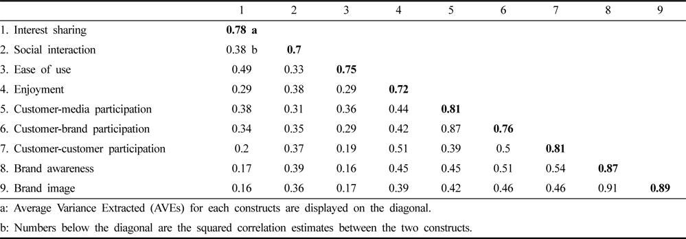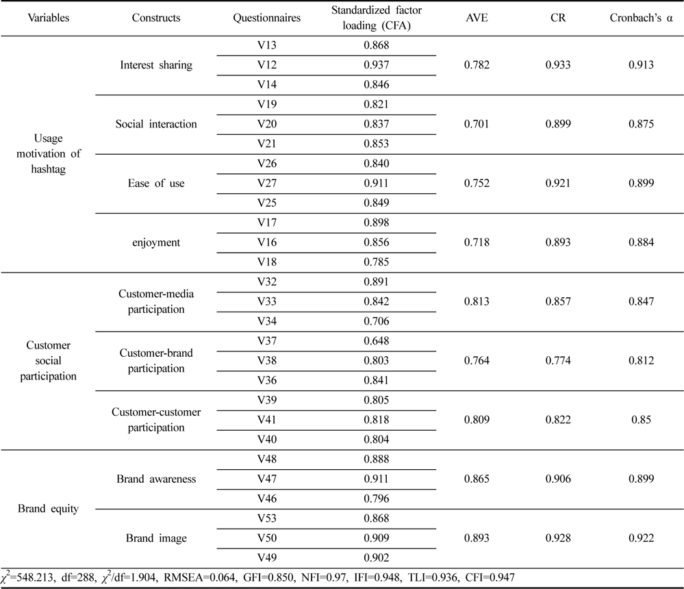 다음으로 확인적 요인분석을 실시하였다. 독립변수인 해시태그의 이용동기로 도출된 총 네가지의 관심공유성, 상호작용성, 편의성, 유희성과 매개변수인 고객-미디어참여, 고객-브랜드참여, 고객-고객참여, 그리고 종속변수인 브랜드 인지도, 브랜드 이미지의 27문항에 대한 신뢰도와 타당도를 검증하기 위해 확인적 요인분석을 하였다. 분석은 AMOS 21.0을 사용하였고 그 결과는 다음 Table 4와 같다.