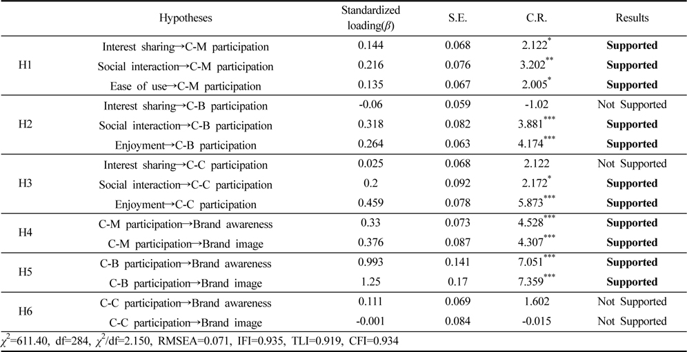 고객소셜참여가 브랜드 이미지와 브랜드 인지도에 미치는 영 향을 살펴본 결과, Table 6에 제시된 바와 같이 고객-고객참여를 제외하고 고객-미디어참여와 고객-고객참여에 유의한 영향을 미친다는 것으로 나타났다. 고객-브랜드참여는 브랜드 인지도(β=.330, t=.073, p<.001)와 브랜드 이미지에 정의 영향(β=.376, t=.087, p<.001)을 미치고, 고객간의 참여는 브랜드 인지도(β=.993, t=.141, p<.001)와 브랜드 이미지에 정의 영향(β=1.250, t=.170, p<.001)을 미치는 것으로 나타났다. 이는 브랜드 자산을 높이기 위해서는 고객의 참여가 선행되어야 함을 의미하며, 이용자들은 관심있는 브랜드를 ‘follow(팔로우)’ 하거나 이미지에 ‘like(좋아요)’를 클릭하는 고객 참여와 브랜드 관계자와 소통하는 브랜드와의 참여가 브랜드 자산에 큰 영향을 미친다는 것을 의미한다. 이는 소비자들이 브랜드 커뮤니티를 통해 브랜드 활동에 참여함으로 브랜드에 대한 긍정적 태도와 브랜드 인지도를 포함한 브랜드 자산이 증가하는 것으로 나타난 Kim et al.(2005)의 연구와 맥을 같이 한다.