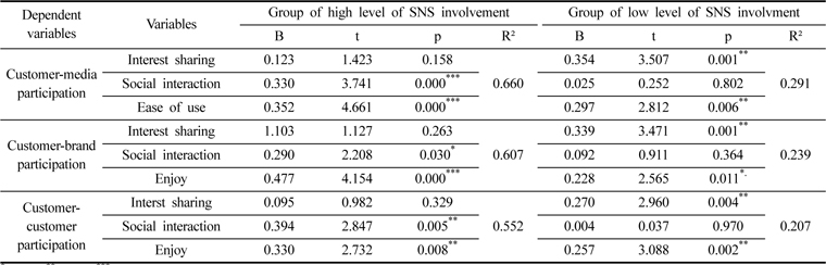 고객-미디어참여를 종속변수로 확인해 본 결과, SNS 참여도가 높은 고관여 집단(R2=0.660, F=56.232, p<.001)은 해시태그의 이용동기중 상호작용성과 편의성이 영향을 미쳤으며, 저관여 집단(R2=0.297, F=17.8, p<.001)은 관심공유성과 편의성이 유의한 영향을 미쳤다.