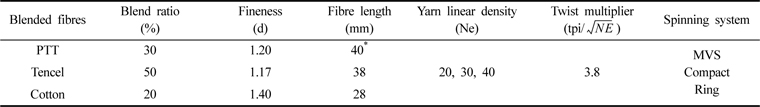 복합사 시료는 PTT/tencel/cotton 원료를 30/50/20의 혼합비로 하였으며 MVS(Murata, MVS 861), compact(Toyota, RX 300), ring정방기(Zinser, MAT 670)에서 20, 30, 40Ne를 방적하였다. 이들의 실과 원료 특성을 Table 1에 나타내었다.