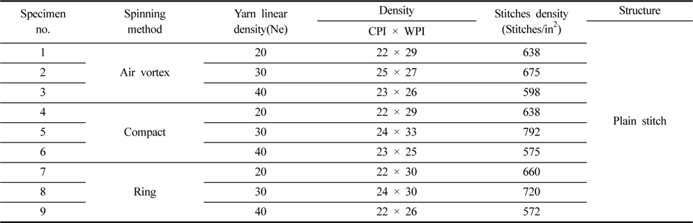 편성물 시료는 20Ne와 30Ne는 2합, 40Ne는 3합 시료를 reel winder에서 준비하였다. 그리고 횡편기(Sima NSSG 14-122sv)에서 14gauge로 평편 조직으로 편직하였다. 편성물 시료의 특성을 Table 2에 나타내었다.