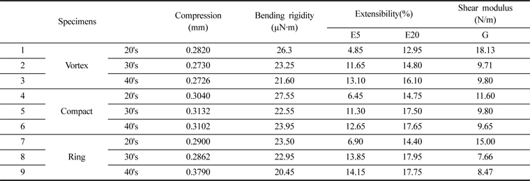 Fig. 4(b)에서는 air vortex사 편성물의 굽힘강성이 ring사 편성물보다 더 큰 값을 보임으로서 더 stiff하다는 것을 알 수 있다. 이 결과는 wool과 레이온 등 다른 소재를 이용한 선행연구(Li et al., 2008; Suzuki & Sukigara, 2013)와 동일한 결과를 보이고 있으며 air vortex사 내부의 core 부분을 형성하고 있는 섬유다발들이 평행하게 배열함으로서 나선구조를 하고 있는 ring과 compact사 편성물보다 더 큰 굽힘강성치를 보인다고 사료된다.