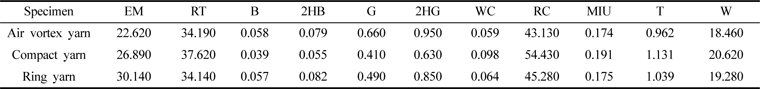 2) KES-FB 역학특성에 의한 의류착용특성도 air vortex사 편성물이 ring사, compact사 편성물보다 더 stiff함을 보였다.