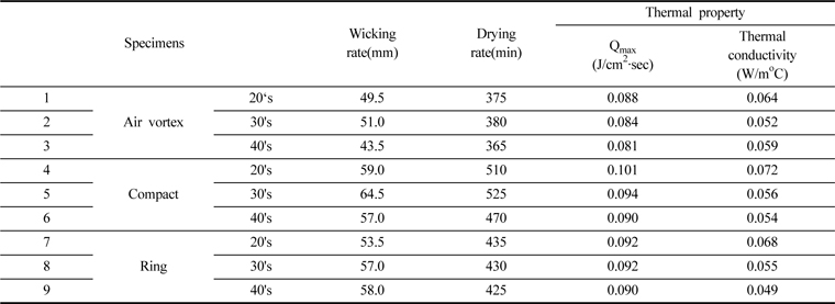 3) Air vortex사 편성물의 wicking성은 compact사, ring사 편성물보다 낮은 값을 보였으며 반면 건조특성은 더 우수한 결과를 보였다. 이는 air vortex사 core부의 평행한 섬유다발과 사표면의 간헐적인 다발형태의 꼬임구조에 기인되었다.