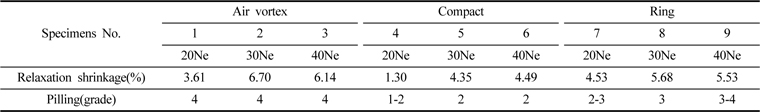 5) Air vortex사 편성물의 열수축률은 ring사, compact사 편성물보다 더 큰 값을 보였으며 pilling성은 더 우수한 결과를 보여주었다. 이는 air vortex사의 벌키한 사구조와 사표면의 모우가 ring사 대비 상대적으로 적은 것에 기인하였다.