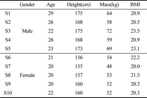 본 연구에서의 피험자는 선행 체표변화 연구(Cho et al., 2015a)와 동일한 피험자로 구성되었다. 측정 대상은 20대 남자 및 여성 각각 5명으로 구성, 총 10명의 피험자를 선정하였으며, 인체의 다양한 체형으로 인한 체표변화의 다양화 및 의복 맞춤성에 미칠 영향을 고려하여, 체형의 측정 대상을 제한, BMI 지수 20.0~25.0 사이에서의 표준체형을 갖는 남성 5명, 여성 5명으로 구성하였다(Table 1). 본 실험에 참여한 피험자들은 실험 수행에 문제가 없는 정상적인 활동 범위를 갖는 건강한 피험자들로 실험 내용을 숙지하고 자발적으로 참여하였으며, 실험에 동의하는 서면 절차를 거쳐 진행하였다.