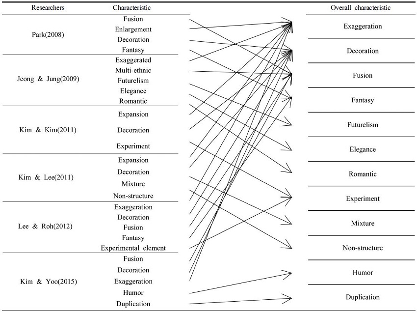 Kim and Kim(2011)은 극도로 확대하고 육중함, 과도함, 인위적인 표현을 통해 나타나는 과장성, 화려하고 파격적이며 독특하고 부조화를 통한 장식성, 무제한적 표현의 자유와 탈피성, 유희성 기괴함, 의외성을 표현하는 실험성 등으로 요약될 수 있다고 하였다.