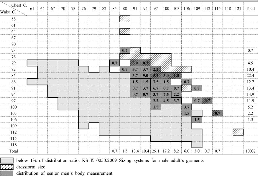 시니어 남성 인체측정치와 국내 시판 드레스폼의 치수분포를 이원분포표로 작성하여 분석하였다. 드레스폼의 치수는 국내 드레스폼 11개 업체 홈페이지에 제시한 62개 드레스폼 치수를 사용하였고, KS규격 ‘성인 남성복 치수’의 신사복 치수 기준을 위한 기본 신체치수인 가슴둘레와 허리둘레를 3cm 간격으로 전개한 구간에 대응하였다.